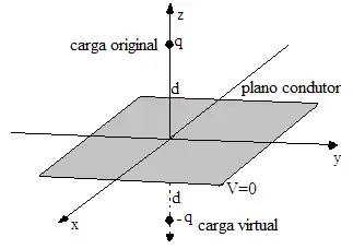 Pelo método das imagens, define-se uma carga pontual, a uma distância -d, no eixo z, negativa, para representar as cargas induzidas no plano. Assim pode-se calcular de forma direta o potencial eletrostático em qualquer posição do espaço mediante esta nova concepção do sistema:
