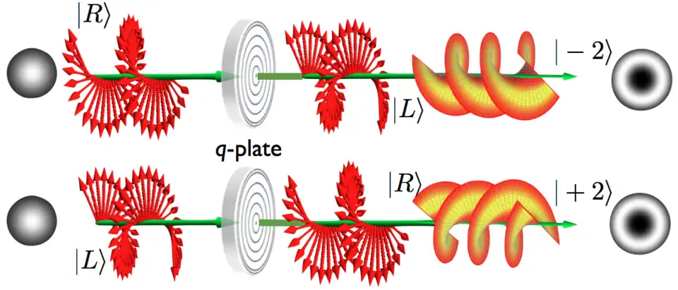 - ↑ Marrucci, L.; Manzo, C.; Paparo, D. (2006). «Optical spin-to-orbital angular momentum conversion in inhomogeneous anisotropic media». Physical Review Letters. 96 (16): 163905. Bibcode:2006PhRvL..96p3905M. PMID 16712234. arXiv:0712.0099