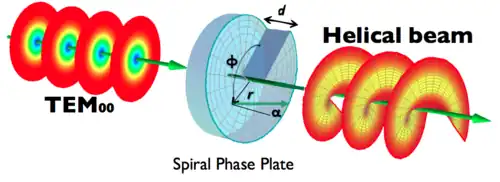 No limite paraxial, o OAM de um feixe de luz pode ser trocado por um material que possui uma heterogeneidade espacial transversal. Por exemplo, um feixe de luz pode adquirir OAM cruzando uma placa de fase em espiral, com uma espessura não homogênea (ver figura).[7]
