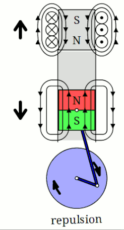 Quando a bobina é alimentada, um campo magnético é gerado em torno do rotor. O lado esquerdo do rotor é empurrado para fora do imã esquerdo e atraído para a direita, causando rotação.