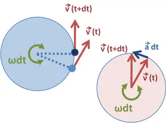 Vetores velocidade no tempo t e tempo t + dt são movidos na órbita à esquerda até novas posições onde duas caudas coincidem, à direita. Devido à velocidade ser fixa em magnitude a v = r ω, os novos vetores velocidade são varridos para um caminho circular com taxa angular ω. À medida em que dt → 0, o vetor aceleração a torna-se perpendicular a v, o que significa que ele aponta em direção ao centro da órbita no cículo da esquerda. O ângulo ω dt é o pequeno ângulo entre as duas velocidades e tende a zero à medida em que dt→ 0.