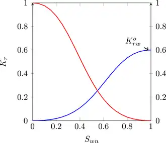 Uma aproximação muitas vezes utilizada de permeabilidade relativa é a correlação Corey que é lei de potência na saturação de água .[3][4] Se (também denotada , ou , ou ) é a saturação de água irreduzível (mínima), e é a saturação de óleo residual (mínima) após a inundação de água (note-se que é a saturação de óleo), podemos definir um valor de saturação de água normalizado (ou escalado)