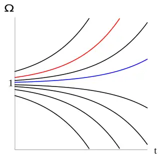 Como a constante é conhecida e a taxa de expansão pode ser medida observando a velocidade com que as galáxias distantes estão se afastando de nós, pode ser determinado. Seu valor atualmente está em torno de 10−26 kg m−3. A razão entre a densidade real e esse valor crítico é chamada de Ω, e sua diferença de 1 determina a geometria do universo: Ω > 1 corresponde a uma densidade maior que a crítica, e, portanto, um universo fechado [en]. Ω < 1 dá um universo aberto [en] de baixa densidade, e Ω igual a exatamente 1 dá um universo plano [en].