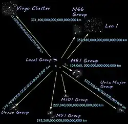 O Laniakea é o superaglomerado que contém o aglomerado de Virgem, Grupo Local, e por extensão no último, nossa galáxia; a Via Láctea.[8] |