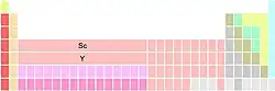 Grupo 3 é o Sc, Y, La e Ac. O lantânio (La) e o actínio (Ac) ocupam as duas posições abaixo do ítrio, sendo esta a variante mais comum.[65][notas 6] Isto enfatiza as similaridades nas propriedades periódicas ao descer nos grupos 1, 2 e 3, ao custo de descontinuidades nas propriedades entre os grupos 3 e 4 e fragmentando os lantanídeos e actinídeos.[notas 7]