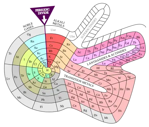 A lei periódica pode ser representada de várias maneiras, sendo a tabela periódica padrão apenas uma delas.[72] Dentro de 100 anos após o surgimento da tabela de Mendeleev em 1869, Edward G. Mazurs reuniu cerca de 700 versões diferentes publicadas da tabela periódica.[73][74] Muitas formas mantêm a estrutura retangular, incluindo a tabela periódica escaliforme de Charles Janet (mostrada abaixo) e a forma modernizada do layout original de 8 colunas de Mendeleev, ainda comum na Rússia. Outros formatos de tabela periódica têm formas muito mais exóticas, como espirais (a de Otto Theodor Benfey está ilustrada à direita), círculos e triângulos.[75]