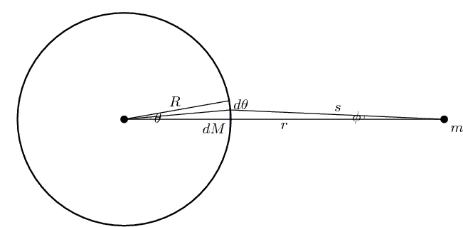 A força exercida no ponto "m" pode ser calculada integrando a força gravitacional de todas as secções.