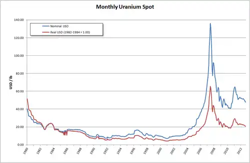 O preço do urânio alcançou um mínimo em janeiro de 2001 á US$ 6,40 por libra de U U3O8.[36]