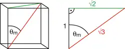 O ângulo θm é o ângulo entre a diagonal espacial de um cubo e qualquer uma das três arestas a ela conectadas, conforme a imagem.