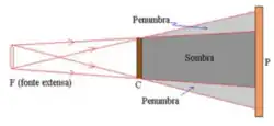 Fonte de luz extensa originando sombra e penumbra por conta de um objeto opaco