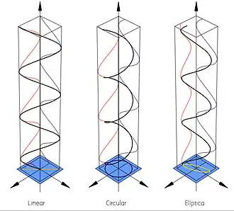 A forma habitual de considerar a polarização é controlar a orientação do vetor campo elétrico de como a onda eletromagnética se propaga. O vetor campo eléctrico de uma onda plana pode ser arbitrariamente dividido em duas componentes perpendiculares aos eixos cartesianos x e y marcadas, com o eixo z indicando o caminho de propagação. A forma traçada no plano x-y pelo vetor campo eléctrico é uma figura de Lissajous que descreve o estado de polarização. As figuras seguintes mostram alguns exemplos da evolução do vetor campo elétrico (em azul), com o tempo (os eixos verticais), num ponto particular no espaço, juntamente com a suas componentes x e y (vermelho / esquerda e verde / direita), e o percurso traçado pelo vetor no plano (roxo): a mesma evolução iria ocorrer quando se olha para o campo elétrico num determinado momento, enquanto evoluindo o ponto no espaço, ao longo da direção oposta à propagação.