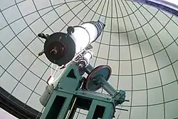 Os primeiros telescópios, chamado telescópios de refração também foram desenvolvidos com uma única lente objetiva e ocular. Em contraste com o microscópio, a lente da objetiva do telescópio foi concebida com um comprimento focal grande para evitar as aberrações ópticas. A lente objetiva foca uma imagem de um objeto distante no seu ponto focal, que é ajustado para estar no ponto focal de uma ocular de uma distância focal muito menor. O objetivo principal de um telescópio não é necessariamente ampliação, mas em vez de recolha de luz que é determinada pelo tamanho físico da lente objetiva. Assim, telescópios são normalmente indicado pelos diâmetros das suas objetivas, em vez de pela ampliação que pode ser alterado mudando as oculares. Como a ampliação de um telescópio é igual ao comprimento focal da objetiva dividida pela distância focal da ocular, menores distâncias oculares focais causam uma maior ampliação.[7]