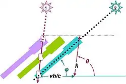 onde , dando os componentes do feixe de luz no referencial da Terra em termos dos componentes no referencial do Sol. O ângulo do feixe no referencial da Terra é, portanto,[5]