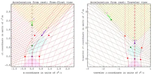 Estas equações descrevem algumas consequências da viagem acelerada em alta velocidade. Por exemplo, imagine uma nave espacial que pode acelerar seus passageiros a uma velocidade a "1 g" (10 m/s2 ou aproximadamente 1,0 ano-luz por ano ao quadrado) a meio caminho de seu destino e, em seguida, desacelerá-los em "1 g" para a metade restante, de modo a fornecer gravidade artificial semelhante à da Terra a partir do ponto A ao ponto B no menor tempo possível.[8][9] Para uma distância de mapa de ΔxAB, a primeira equação acima prevê um fator de Lorentz de ponto médio (acima do seu valor unitário de repouso) de γmid = 1 + α(ΔxAB/2)/c2. Portanto, o tempo de ida e volta nos relógios viajantes será Δτ = 4(c/α) cosh−1(γmid), durante o qual o tempo decorrido nos relógios dos mapas será Δt = 4(c/α) sinh[cosh−1(γmid)].