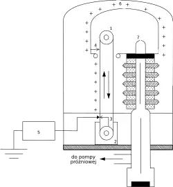 A carga é aplicada à correia por meio de um pente de aço que encosta na correia. Este pente é polarizado por uma fonte de alta tensão (tipicamente de 5kV a 50 kV).