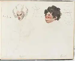 1820. Caricaturas em aquarela dos matemáticos franceses Adrien-Marie Legendre (esquerda) e Joseph Fourier (à direita), do pintor francês Julien-Leopold Boilly, retratos de aquarela de números 29 e 30 do Album de 73 portraits-charge aquarellés des membres de I’Institut.[1]
