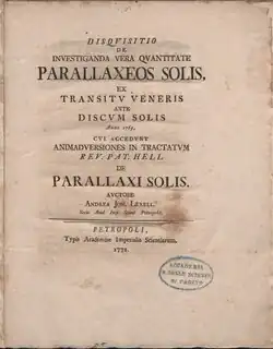 - ↑ A. J. Lexell (1772). Disquisitio de investiganda vera quantitate parallaxeos solis, et transitu Veneris ante discum solis anno 1769, cui accedunt anumadversiones in tractatum rev. pat. Hell de parallaxi solis. [S.l.: s.n.] 131 páginas