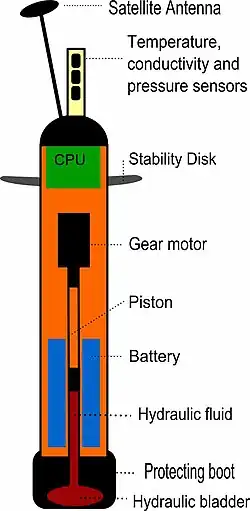 As sondas do sistema Argo, são na verdade planadores subaquáticos, pois precisam ter a capacidade flutuar, submergir e emergir nos oceanos numa periodicidade pré estabelecida. Nesse caso, as sondas fazem isso, alterando a sua própria densidade. A densidade de qualquer objeto, é obtida dividindo a sua massa pelo seu volume. As sondas Argo, mantem sua massa constante, mas alteram o seu volume, usando pistões hidráulicos para injetar óleo mineral numa bolsa de borracha na base da sonda, que menos densas, sobem. Quando o período na superfície está completo, os pistões sugam o óleo e a sonda desce novamente.[5]
