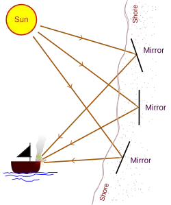 Luciano de Samósata, escritor do século II, escreveu que durante o Cerco a Siracusa (c. 214–212 a.C.), Arquimedes destruiu navios inimigos com fogo. Séculos depois, Antêmio de Trales menciona espelhos ustórios como a arma utilizada por Arquimedes.[35] O dispositivo, algumas vezes chamado de "raio de calor de Arquimedes" ou "raio solar de Arquimedes", teria sido usado para concentrar a luz solar em navios que se aproximavam, levando-os a pegar fogo.