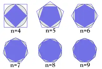 Arquimedes foi capaz de usar infinitesimais de uma maneira que é semelhante ao moderno cálculo integral, e frequentemente diz-se que é muito provável que se os gregos antigos possuíssem uma notação matemática mais apropriada (tais como um sistema numérico posicional e notação algébrica), ele teria inventado o cálculo.[51][52][53] Através de provas por contradição (reductio ad absurdum), ele encontrou respostas aproximadas para problemas diversos, especificando os limites entre os quais se encontrava a resposta correta. Esta técnica é conhecida como o método da exaustão, e ele empregou-o para aproximar o valor de π (pi). Ele conseguiu isso desenhando um polígono regular inscrito e outro circunscrito a um mesmo círculo. Aumentando-se o número de lados do polígono regular, ele se torna uma aproximação mais precisa de um círculo. Quando os polígonos tinham 96 lados cada um, ele calculou os comprimentos de seus lados (sabendo o comprimento dos lados de um polígono regular de n lados, Arquimedes sabia como calcular o comprimento dos lados de um polígono regular de 2n lados e mesmo raio)[54] e mostrou que o valor de π está entre 31⁄7 (aproximadamente 3,1429) e 310⁄71 (aproximadamente 3,1408), consistente com o seu valor real de cerca de 3,1416. Ele também mostrou que a área de um círculo é igual a π multiplicado pelo quadrado do raio do círculo. Em Sobre a Esfera e o Cilindro, além dos resultados principais, Arquimedes postulou que qualquer grandeza quando adicionada a ela mesma suficientes vezes excederá qualquer grandeza dada. Este é o axioma de Arquimedes dos números reais.[55] Um dos lemas utilizados por Arquimedes em seu resultado sobre a área da superfície esférica é agora visto como um caso especial do teorema de Duistermaat-Heckman em geometria simplética (descoberto dois milênios após Arquimedes).[56][57][58]