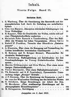 - Einstein, Albert (1905). «Über einen die Erzeugung und Verwandlung des Lichtes betreffenden heuristischen Gesichtspunkt» [On a Heuristic Point of View about the Creation and Conversion of Light]. Annalen der Physik (em alemão). 17 (6): 132–148. Bibcode:1905AnP...322..132E. doi:10.1002/andp.19053220607