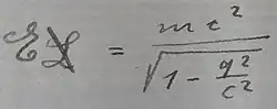A equação estabelece que a energia de um corpo em repouso (E) iguala sua massa (m) vezes a velocidade da luz (c) ao quadrado, ou E = mc2.[5][6]