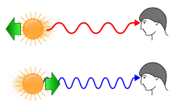 Analogamente ao efeito Doppler clássico, o efeito Doppler relativístico refere-se à mudança da frequência percebida por um observador em movimento relativo à fonte de emissão da onda. No entanto, a versão relativística ocorre em uma onda eletromagnética, desviando a luz para frequências mais baixas (em direção ao vermelho) se a fonte afasta-se relativamente ao observador; e desviando a luz para frequências mais altas (em direção ao azul) caso a fonte esteja se aproximando. Esse fenômeno é resultado da relatividade restrita, embasada matematicamente pelas transformações de Lorentz.[16][17]