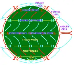 Uma vista idealizada das três grandes células de circulação atmosférica