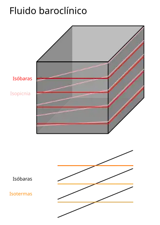 Baroclinia é um estado do escoamento de um fluido em que as linhas isóbaras (de igual pressão) e isotermas (igual temperatura) não coincidem. Assim, a temperatura varia sobre superfícies isobáricas e a pressão sobre superfícies isotérmicas.[1]