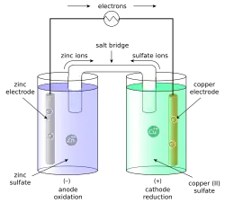 Segundo Atkins e Jones,[12] para que os elétrons passem dos átomos de Zn para os íons Cu2+ e permitam que a reação espontânea ocorra, eles tem de passar por um fio que servirá de circuito externo e depois pelo elétrodo de Cu até a solução de sulfato de cobre (II). Os íons Cu2+ convertem-se em átomos de Cu no cátodo, simultaneamente, os átomos de Zn convertem-se em íons Zn2+ no ânodo. À medida que se vai ocorrendo a redução, a solução no cátodo adquire carga negativa (excesso de elétrons no meio), enquanto a solução no ânodo começa a desenvolver carga positiva (ausência de elétrons no meio). Para que esse processo não cause a interrupção no fluxo de elétrons, a pilha pode conter uma parede permeável ou uma ponte salina (com cloreto de potássio, os íons Cl migram em direção ao ânodo e os íons K+ migram em direção ao cátodo) que fazem o contato entre as duas células. As reações de elétrodo e a reação da célula são: ânodo: Zn (s) Zn2+(aq) + 2 e