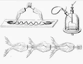 Nos primórdios da pesquisa elétrica, um método comum para detectar corrente elétrica era por meio de um galvanoscópio de perna de sapo [en]. Os pesquisadores mantinham um bom suprimento de sapos vivos para preparar suas pernas para o galvanoscópio. Assim, os sapos eram um material conveniente para outros experimentos. Eram pequenos, fáceis de manejar, suas pernas eram especialmente sensíveis à corrente elétrica e continuavam respondendo por mais tempo do que outros animais candidatos para essa função.[1][2]