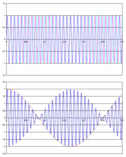 Vamos supor que as frequências angulares ω1 > ω2 das ondas que se combinam são quase iguais. Nesse caso podemos considerar a equação acima como uma função cosseno cuja frequência angular é ω e cuja amplitude é o valor absoluto do fator entre colchetes.