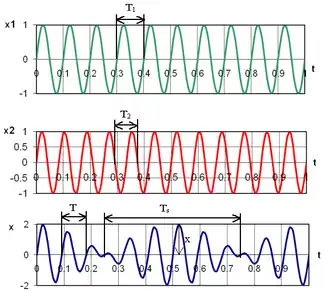 O número de batimentos por segundo é dado pela diferença entre as frequências das duas ondas componentes:[4]