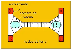 A figura 2 apresenta um esquema em perfil do betatron, em que é possível ver o enrolamento primário, o núcleo de ferro e a câmara de vácuo.