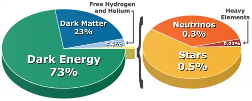 Acredita-se que a pressão negativa seja uma propriedade da energia do vácuo, mas a natureza exata e a existência da energia escura permanecem como um dos grandes mistérios do Big Bang. Os resultados da WMAP em 2008 estão de acordo com um universo que consiste de 73% de energia escura, 23% de matéria escura, 4,6% de matéria regular e menos de 1% de neutrinos.[81] Segundo a teoria, a densidade de energia na matéria diminui com a expansão do universo, mas a densidade de energia escura permanece constante (ou quase) à medida que o universo se expande. Portanto, a matéria constituiu uma fração maior da energia total do universo no passado do que hoje, mas sua contribuição fracionária cairá no futuro distante à medida que a energia escura se tornar ainda mais dominante.[81]