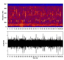 Sonograma (acima) e oscilograma (abaixo) do canto de uma baleia-jubarte.