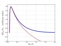 Resultado clássico de Bekefi para o espetro de potência de emissão de bremsstrahlung de uma distribuição eletrónica maxwelliana. Diminui rapidamente para grandes e é também suprimido perto de . Este gráfico refere-se ao caso quântico , e . A curva azul é a fórmula completa com ; a curva vermelha é a forma logarítmica aproximada para .
