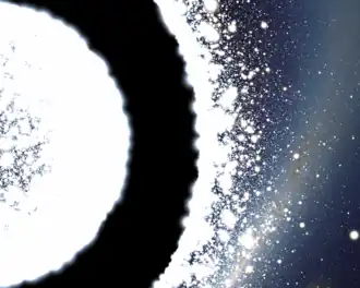 Representação artística de um buraco de minhoca tipo Schwarzschild, visto por um observador cruzando o horizonte de eventos, o qual é semelhante a um buraco negro Schwarzschild, mas com a singularidade substituída por um caminho instável para um buraco branco em outro universo. O observador vem da direita, e o outro universo torna-se visível no centro da sombra do buraco de minhoca logo que o horizonte é cruzado. Esta nova região, todavia, é inalcançável no caso de um buraco de minhoca Schwarzschild, visto que a ponte entre o buraco negro e o buraco branco sempre entrará em colapso antes que o observador tenha tempo de atravessá-la. Ver Buracos Brancos e Buracos de Minhoca para uma discussão mais técnica e uma animação do que um observador veria ao cair num buraco de minhoca Schwarzschild.