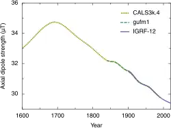 A direção e a intensidade do dipolo mudam com o tempo. Nos últimos dois séculos, a força dipolar diminuiu a uma taxa de cerca de 6,3% por século.[13] Nesse ritmo de queda, o campo magnético se tornaria insignificante em cerca de 1600 anos.[33] No entanto, essa força é aproximadamente a média dos últimos 7 mil anos e a atual taxa de mudança não é incomum.[34]