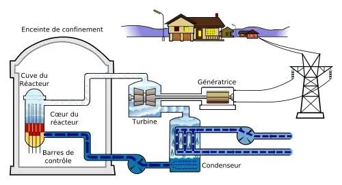 No caso das usinas de água pressurizada, a água quente vinda do reator passa por muitos canos para que aqueça um segundo tanque. A água desse tanque não está sobre tanta pressão, acabando por evaporar e passar por turbinas que, ao serem giradas, produzem grandes quantidades de eletricidade. O vapor de água do segundo tanque passa por uma série de tubulações até ser resfriado pela proveniente do exterior, seja de rios, mares ou lagos. A água vinda do ambiente não sofre contaminação pois esta não entra em contato com o reator e volta para o ambiente logo após ser usada para resfriar o vapor das turbinas.