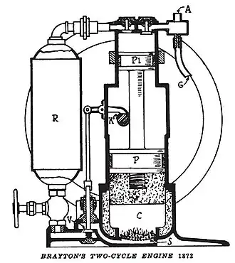 Em 1872, George Brayton pediu uma patente para o seu "Ready Motor", motores que usavam um compressor de pistão separado do expansor, injetando ar comprimido quente pelo cilindro interno do expansor. As primeiras versões do motor de Brayton eram os motores a vapor que misturavam o Combustível e o ar enquanto o compressor, por meio de um Carburador em uma superfície aquecida.[2] O combustível/ar ficava contido em um reservatório e depois ia para um cilindro de expansão onde era queimado, a medida com que o combustível entrava no cilindro de expansão era acendida uma chama piloto. Uma tela de proteção foi usada para impedir que o fogo voltasse para o reservatório, porém nas primeiras tentativas tal tela falhava e uma explosão ocorria.