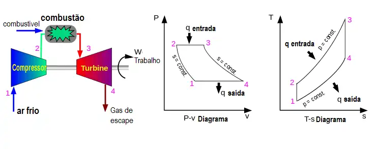 Entre 1 e 2 o ar em condição ambiente passa pelo compressor, onde por compressão adiabática e isotrópica ocorre o aumento de temperatura e consequente aumento de entalpia. Comprimido, o ar é direcionado às câmaras, entre 2 e 3, onde é misturado ao combustível possibilitando sua queima e seu aquecimento tendo sua pressão constante. Ao sair da câmara de combustão, os gases, à alta pressão e temperatura, se expandem conforme passam pela turbina, entre 3 e 4. Na medida em que o fluido fornece o trabalho sobre as palhetas, reduzem-se a pressão e temperatura dos seus gases, gerando-se potência mecânica. A potência extraída através do eixo da turbina é usada para acionar o compressor. A quarta etapa representa a transferência de calor do fluido para o ambiente em que se encontra.Desta forma, mesmo se tratando de um ciclo aberto, parte da energia gerada pela combustão é eliminada por forma de calor nos gases quentes fluindo como escape. A rejeição de calor é um limite físico, intrínseco ao funcionamento de Ciclo termodinâmico, mesmo nos casos ideais, como define a Segunda lei da termodinâmica.[4]