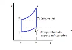 Um ciclo de Brayton que é dirigido em sentido inverso, através de entrada de trabalho de rede, e quando o ar é o fluido de trabalho, é o ciclo de refrigeração a gás ou ciclo de Bell Coleman. Seu objetivo é mover calor, em vez de produzir trabalho. Esta técnica de arrefecimento a ar é amplamente utilizada em aviões a jato e para sistemas de Ar condicionado que utilizam ar comprimido a partir dos compressores do motor. Também é usado na indústria de GNL, onde o maior ciclo de brayton reverso é para sub-resfriamento LNG usando 86 MW de potência de um compressor de turbina a gás e Nitrogênio.[18] Vide figura, o funcionamento deste ciclo se dá pela compressão de 1 a 2, após isto, o ar é resfriado em consequência da transferência de calor ao meio envolvente (a temperatura ). O ar é então expandido, no processo 3-4, até a pressão de entrada do compressor e a temperatura cai para , no expansor. Calor pode, então, ser transferido ao ar até que se atinja a temperatura . O trabalho para esse ciclo, é representado pela área 1-2-3-4-1 e o efeito frigorífico é representado pela área 4-1-b-a-4. O coeficiente de eficácia é a relação entre estas duas áreas.[19]