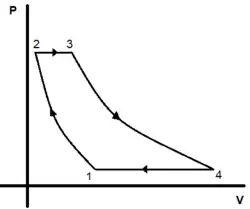A pressão em 1 e 4 temos um processo isobárico, bem como em 2 e 3. Assim e . Como as outras partes do ciclo são adiabáticas e reversíveis, tem-se: