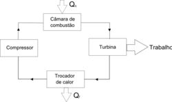 O ciclo Brayton é um processo utilizado, principalmente, em turbinas a gás. Ele pode operar em um ciclo aberto e em um ciclo fechado. Quando operada em um ciclo aberto, o gás utilizado entra uma câmara de compressão, pelo bocal de admissão. Em seguida, o gás passa por uma câmara de combustão à pressão constante, onde reage com o combustível. Por fim, os gases de combustão passam pela turbina e são eliminados pelo duto de escape. Este ciclo pode ser utilizado como motor de veículos terrestres, marítimos ou aéreos. Já no ciclo fechado, o gás, na câmara de combustão, recebe calor de uma fonte quente externa. Após a passagem do gás pela turbina, um trocador de calor recebe o gás, em que há a liberação de calor para uma fonte fria externa, de modo que o ar volte ao seu estado inicial. Este último ciclo pode ser utilizado em uma usina termoelétrica.[20]