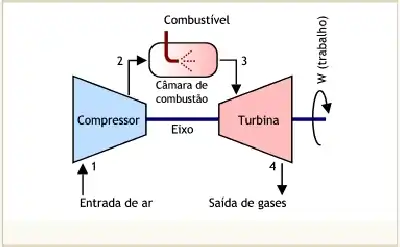 Uma turbina a gás também é um motor de Brayton, composto pelos itens acima já citados, onde o ar ambiente é aspirado para dentro do compressor, posteriormente pressurizado, se tratando de um processo isentrópico, o ar comprimido passa então através de uma câmara de combustão (Simples ou múltipla[5]), onde o combustível é queimado, aquecendo o ar - um processo de pressão constante, uma vez que a câmara está aberta para entrar e sair; um processo isobárico, o ar aquecido e pressurizado então fornece sua energia, expandindo-se através de uma turbina (ou série de turbinas). Parte do trabalho extraído pela turbina é usado para conduzir o compressor; um processo isentrópico, e por fim rejeição de calor (na atmosfera); um processo isobárico.