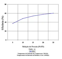 O aumento da pressão, aumenta a eficiência do ciclo de Brayton, ou seja, existe uma relação de pressão crescente. Isto é análogo ao aumento da eficiência observado no ciclo Otto, quando a taxa de compressão é aumentada. No entanto, os limites práticos ocorrem quando se trata de aumentar a proporção da pressão. Em primeiro lugar, o aumento da taxa de pressão aumenta a temperatura de descarga do compressor.Isso pode causar a saída da temperatura dos gases deixando o combustor exceder os limites metalúrgicos da turbina. Além disso, o diâmetro das lâminas do compressor diminui progressivamente nos estádios de pressão mais altos do compressor. Uma vez que o espaço entre as lâminas e o revestimento do motor aumenta em tamanho como uma porcentagem da altura da lâmina do compressor à medida que as lâminas ficam menores em diâmetro. Uma maior porcentagem do ar comprimido pode escorrer atrás das lâminas em estádios de pressão mais alta, isso causa uma queda na eficiência do compressor, e é mais provável que ocorra em turbinas a gás menores (uma vez que as lâminas são menores para começar). Finalmente, como pode ser visto na Figura 1, a eficiência aumenta a taxa de pressão. Por isso, é esperado um pequeno acréscimo ao aumentar o índice de pressão se já estiver alto.