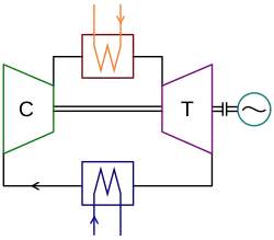 Um ciclo fechado de Brayton circula o fluido de trabalho, o ar expelido da turbina é reintroduzido no compressor, este ciclo utiliza um permutador de calor para aquecer o fluido de trabalho em vez de uma câmara de Combustão interna. O ciclo de Brayton fechado é usado, por exemplo, em turbinas a gás de ciclo fechado e geração de energia espacial. O ciclo de Brayton , assim como os outros ciclos apresenta dois processos isobáricos e dois isoentrópicos. Diferencia-se pelo fato de que o fluido de trabalho, em seu ciclo, não apresenta mudança de fase (o fluido sempre está na fase de vapor). O ciclo fechado de Brayton é o próprio ciclo ideal da turbina a gás simples. O ciclo fechado utiliza-se de dois processos de transferência de calor.[13] Utiliza-se no ciclo algumas ferramentas que atuam com papéis relevantes, como um permutador de calor para aquecer o fluido de trabalho ao invés de uma câmera de combustão interna.[14] O funcionamento, de forma geral, do ciclo citado ocorre através da entrada da entrada de ar no compressor, nas condições de uma determinada temperatura e pressão. O ciclo terá um temperatura máxima suportada e um pressão de escape na saída do compressor. O ciclo terá, também, uma eficiência para o compressor e também para a turbina. Após a circulação gás dentro do ciclo, obtém-se de forma calculada o trabalho do compressor, da turbina e o rendimento do ciclo todo. Admite-se muitas vezes, para melhor realização dos trabalhos e dos rendimentos, que o ar comporta-se como gás perfeito e que apresenta calor específico de valor constante e que cada processo ocorre em regime permanente e que não apresentem variações de energia cinética ou potencial.