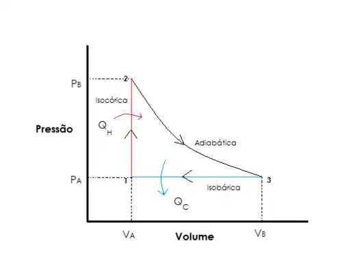 De acordo com o ciclo, o pistão inicial (1), quando há adição de calor ocorre um aumento de pressão a volume constante, (2); Do ponto (2) para o (3) ocorre uma expansão e de (3) para (1) o calor é liberado a pressão constante.
