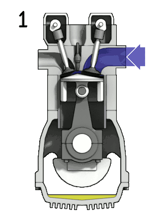 Se limitando para os motores a combustão interna de duas válvulas, nas quais, são ligadas ao comando de válvula. Uma delas é a chamada de válvula de admissão (à direita na animação), que permite a introdução no cilindro de uma mistura gasosa composta por ar e combustível e a outra é chamada de válvula de escape (ou exaustão, à esquerda na animação), que permite a expulsão para a atmosfera dos gases queimados, o ciclo de funcionamento de um motor de combustão a 4 tempos é o seguinte: